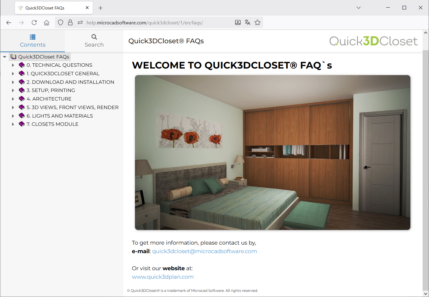 This option shows the Quick3DCloset® "Frequently Asked Questions (FAQs)". You can visit the "Frequently Asked Questions (FAQs)" help by clicking here: https://help.microcadsoftware.com/quick3dcloset/1/en/faqs/