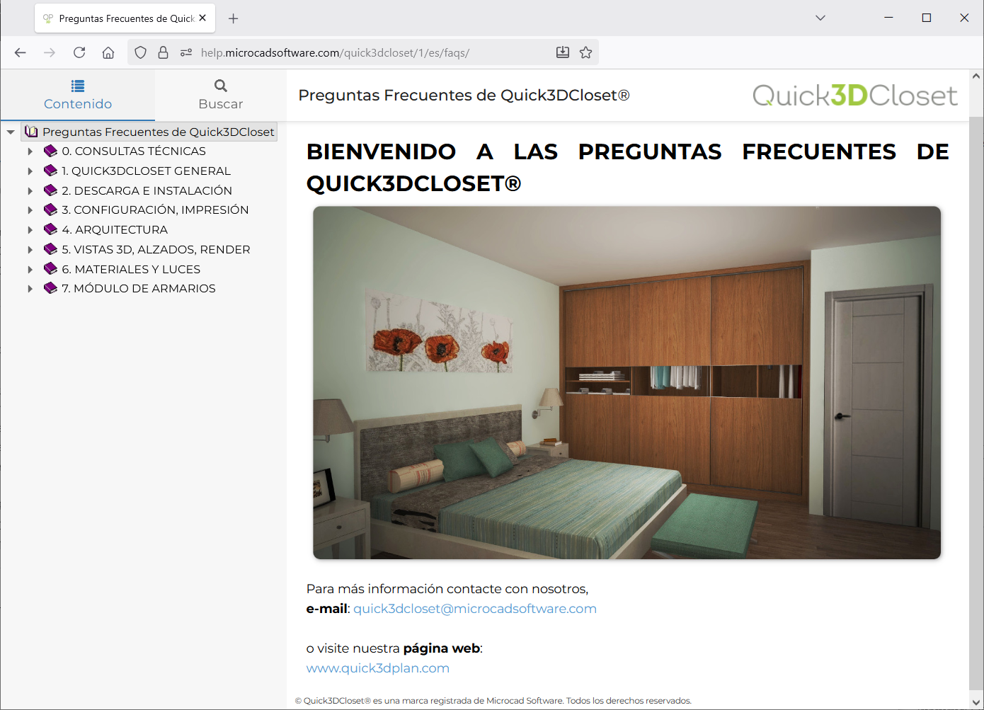 Esta opción muestra las "Preguntas Frecuentes (FAQs)" de Quick3DCloset®. Puede visitar la ayuda de las "Preguntas Frecuentes (FAQs)" haciendo clic aquí: https://help.microcadsoftware.com/quick3dcloset/1/es/faqs/