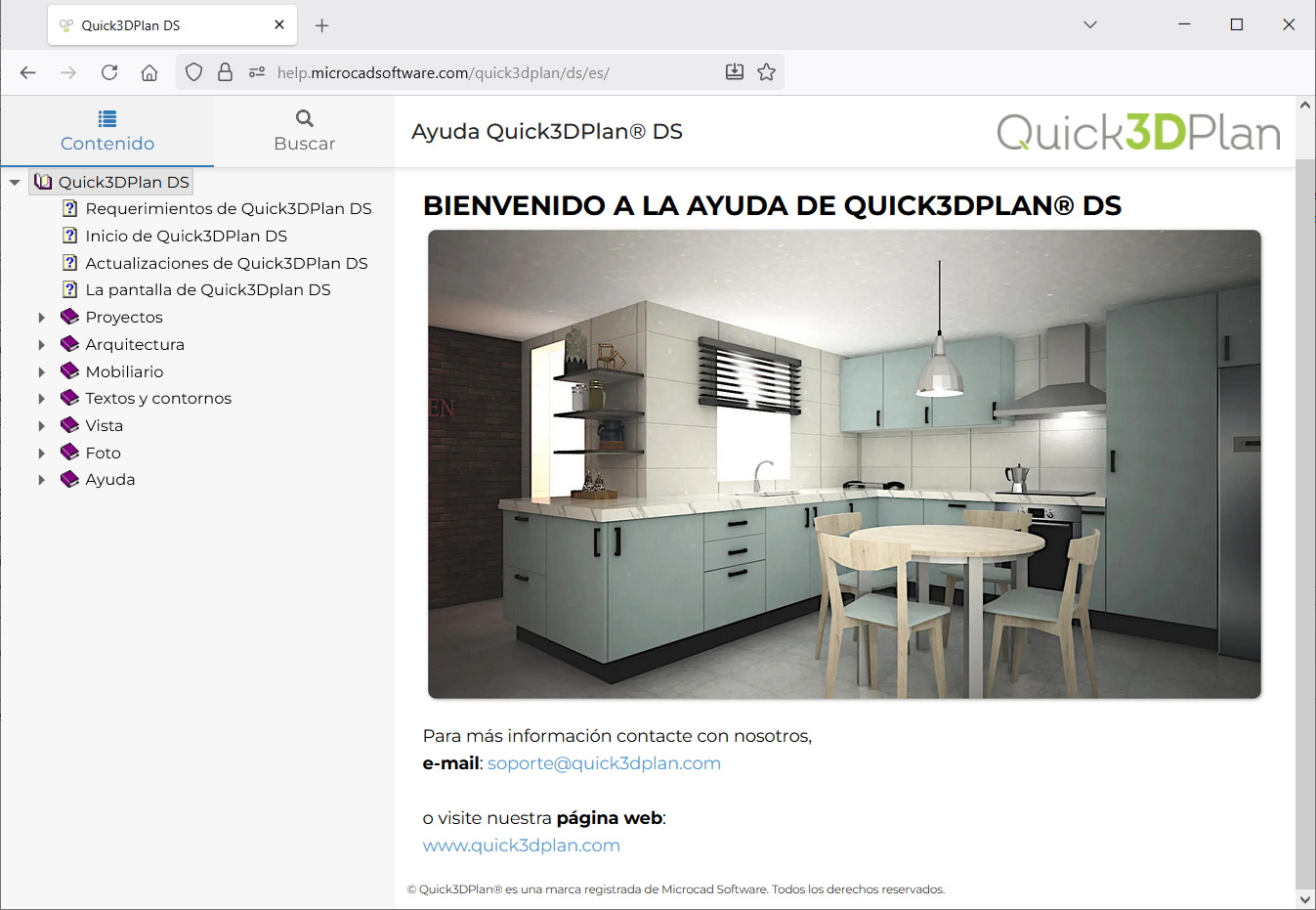 Quick3DPlan® DS incorpora en esta opción la ayuda en línea del programa. En ella podrá consultar rápidamente cualquier duda que le surja sobre el funcionamiento del programa. Puede consultar la ayuda en línea haciendo clic aquí: https://help.microcadsoftware.com/quick3dplan/ds/es/